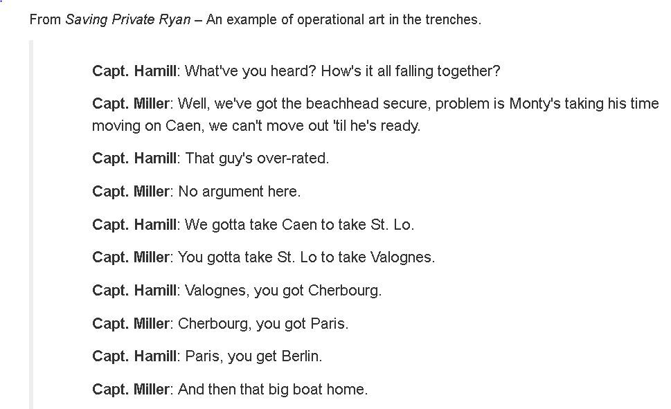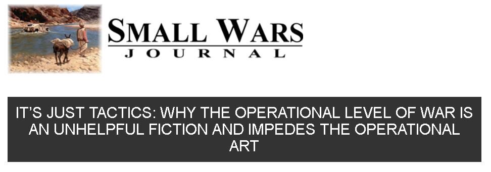 Recomiendo la lectura del artículo It’s Just Tactics: Why the Operational Level of War is an Unhelpful Fiction and Impedes the Operational Art de Lawrence M. Doane.