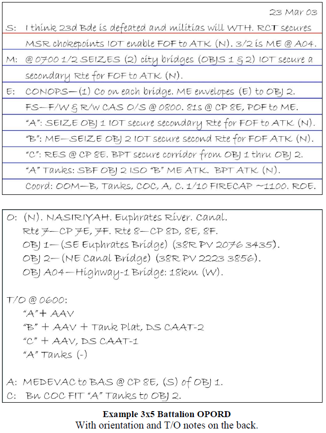 Los relatos de combate desde la Segunda Guerra Mundial hasta Irak muestran que el Cuerpo de Marines ha funcionado históricamente a base de órdenes verbales. Muchas biografías de líderes bélicos, como Patton, Slim, Rommel y von Mellenthin, muestran que estos hombres insistían en las órdenes verbales. Los líderes aprenden que el combate es un entorno competitivo que cambia rápidamente, en el que la descentralización y la iniciativa de las pequeñas unidades se dinamizan mediante órdenes verbales concisas. Las decisiones rápidas requieren órdenes rápidas. Los detalles de los planes de guerra, los desembarcos anfibios, los planes de movimiento y las grandes operaciones deliberadas no pueden comunicarse mediante órdenes verbales. Sin embargo, para el entorno rápidamente cambiante del combate, el Cuerpo de Marines necesita ser bueno en las órdenes verbales. Esta habilidad clave acelera nuestro ritmo y mantiene nuestro ímpetu. Una decisión táctica no tiene sentido sin la capacidad de comunicarla clara y rápidamente. Su capacidad para emitir una orden breve, clara y sin ambigüedades es una habilidad de combate difícil pero esencial. Esto requiere orientación, entrenamiento y práctica.