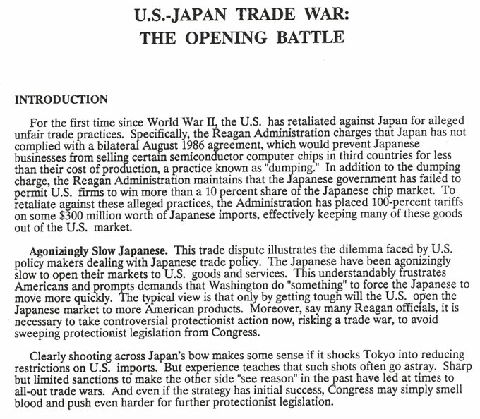 En 1987, Washington se empeñó aún más en quebrar la base manufacturera de Japón imponiendo aranceles del 100% a importaciones japonesas por valor de 300 millones de dólares, bloqueándolas de hecho del mercado estadounidense.