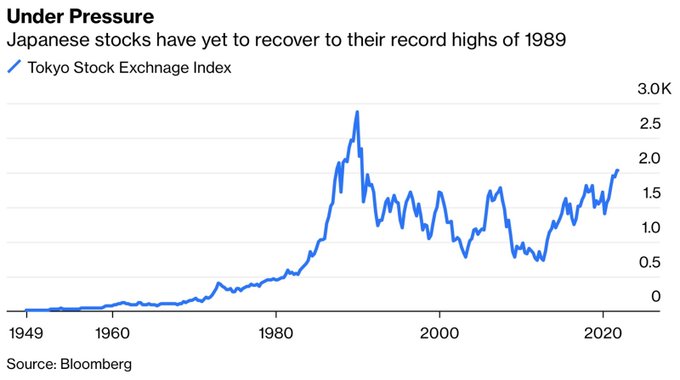 La desregulación que siguió también hizo que el capital extranjero fluyera hacia Japón como una manguera. El índice bursátil de Tokio subió un 49% el año siguiente a los acuerdos. En 1989, había subido un 300% y las acciones japonesas representaban casi la mitad de la capitalización bursátil mundial.