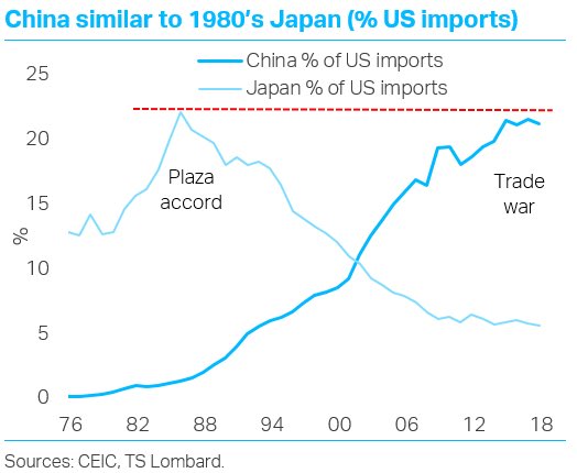 Ahora, casi cuatro décadas después de los Acuerdos del Plaza, está surgiendo un escenario superficialmente similar a medida que China eclipsa económicamente a Estados Unidos, con una importante diferencia: Estados Unidos no tiene la capacidad directa de obstaculizar la economía china como hizo con Japón.