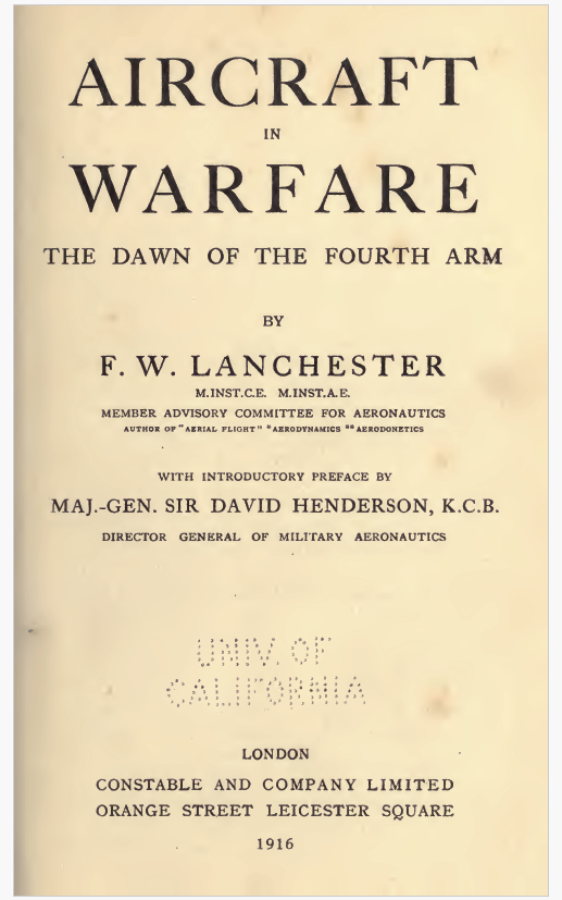 1. Aircraft in Warfare. The Dawn of The Fourth Army; 1916, London, Constable and company limited. Frederick Lanchester. (Enlace en la imagen).