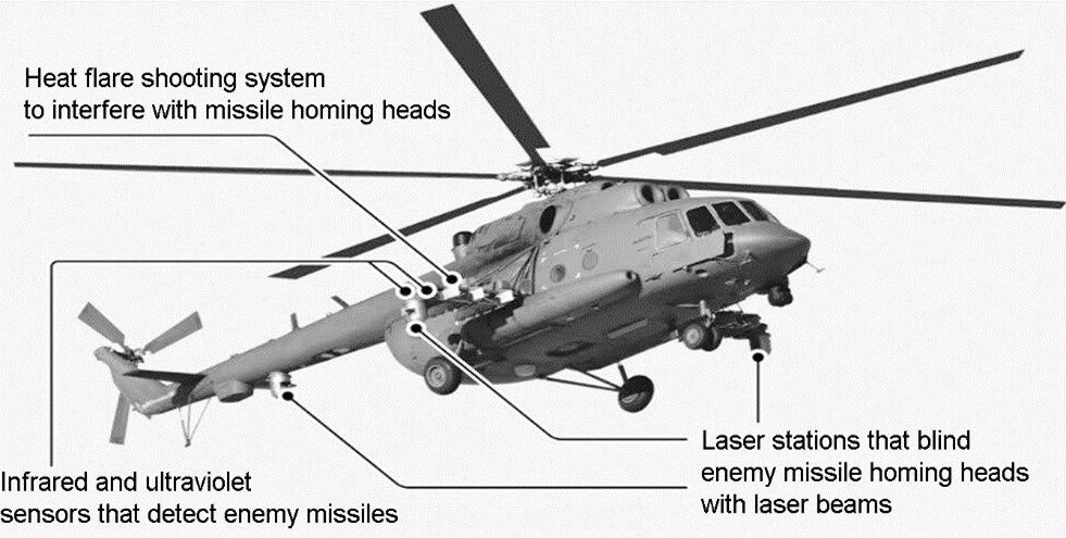 La presencia de MANPAD permite al enemigo atacar objetivos aéreos de baja altitud a distancias de varios kilómetros, lo que los convierte en un medio conveniente para defender a las tropas contra ataques aéreos. Las contramedidas infrarrojas (señuelos) se consideran actualmente el principal método de defensa contra los MANPADS. Sin embargo, los últimos misiles tierra-aire pueden distinguir la temperatura del motor del helicóptero y los gases de escape del señuelo, y algunos de ellos incluso seleccionan objetivos en función de varios parámetros a la vez. Por lo tanto, para proteger a los helicópteros de los medios de defensa aérea enemigos (búsqueda, supresión e interrupción de ataques), es necesario desarrollar e instalar en ellos equipos especiales, en particular, dispositivos que permitan advertir oportunamente a la tripulación de la irradiación de radar y láser, crear interferencias activas, realizar la supresión y cegamiento óptico-electrónico (láser) de las cabezas guía de los misiles antiaéreos (ver Fig. 3), y también montar protectores de pantalla.