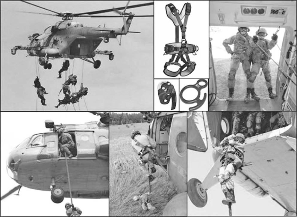 La dificultad de desembarcar tropas directamente en el objeto a capturar mientras se restaura la efectividad de combate de la mayoría de sus fuerzas de cobertura, protección y defensa requiere la búsqueda e implementación de enfoques no convencionales para determinar la composición de las fuerzas y el equipo de los grupos de reconocimiento de seguimiento y las unidades de avanzada que se envían por delante de las principales fuerzas de asalto aerotransportado táctico a lo largo de la trayectoria de vuelo; los lugares donde aterrizarán; los medios para suprimir los activos de defensa, protección y defensa aérea del enemigo; así como los sitios de aterrizaje. En nuestra opinión, lo más aceptable a este respecto pueden ser los métodos de rapel desarrollados del grupo aerotransportado avanzado utilizando dispositivos de cuerdas y cables especiales sin aterrizaje de helicópteros en tierra (ver Fig. 4), (9) lo que facilitará la creación oportuna de elementos de la franja de apoyo para limitar las acciones de las reservas enemigas más cercanas en las aproximaciones al área de aterrizaje de las fuerzas principales del asalto aerotransportado táctico.