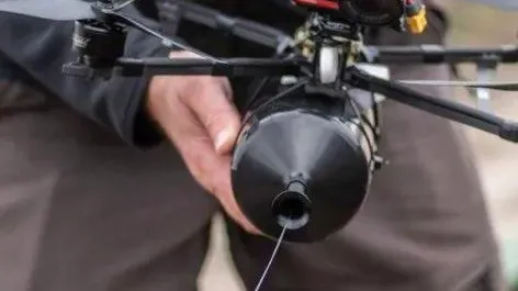 Esta taxonomía forma un marco modelable para la clasificación y el uso de los sUAS. Tomemos como ejemplo el dron que aparece a continuación, extraído de un artículo reciente de Forbes. El artículo trata sobre la reciente innovación rusa en el campo de batalla de modificar drones con cables de fibra óptica para permitir su funcionamiento en entornos saturados de guerra electrónica, donde las interferencias impiden el control por radiofrecuencia.