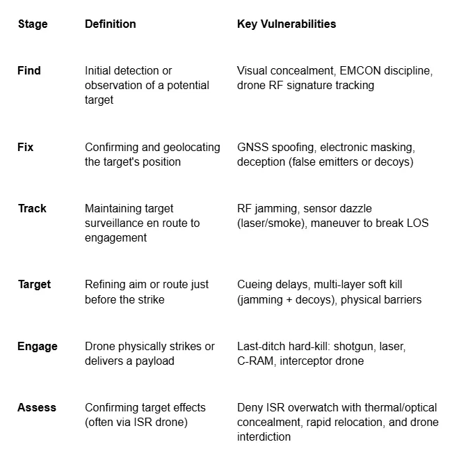 En la práctica, este ciclo se distribuye ahora a menudo entre varios drones. Un cuadricóptero ISR puede «encontrar» un objetivo, un dron relé puede ayudar a «fijar» su posición, un dron FPV se lanzará para «atacar» y un recurso ISR secundario confirmará la «evaluación». Esta separación de funciones permite ataques masivos y asincrónicos, que abruman a los defensores, que solo reaccionan cuando el dron terminal está demasiado cerca. Las vulnerabilidades clave se tratarán en próximas entregas de este manual, ya que constituyen la base para derrotar a los sUAS.