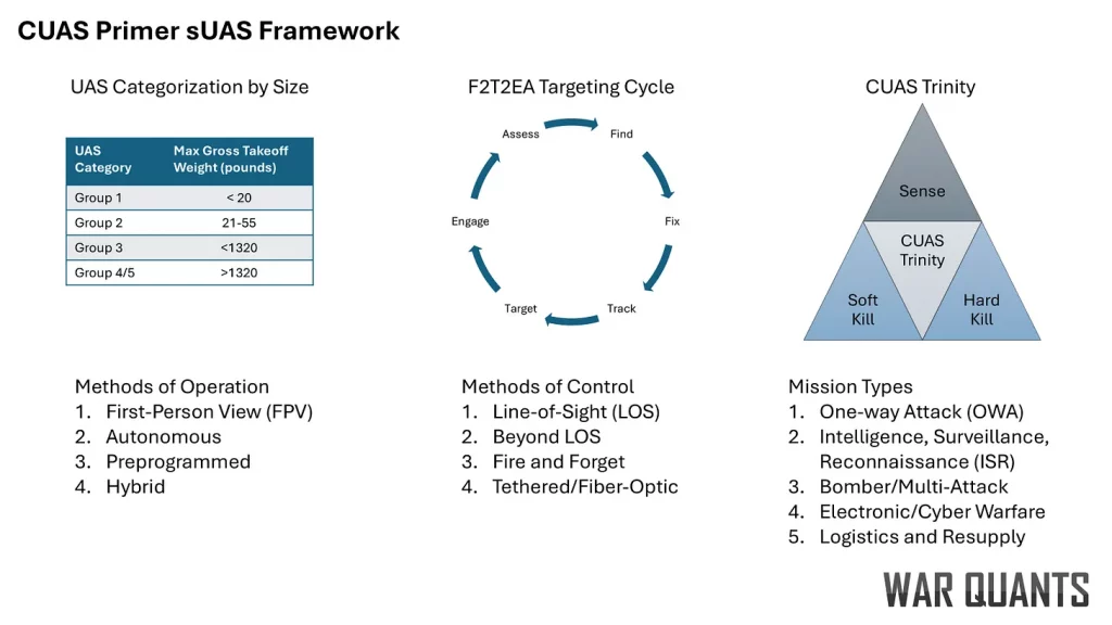 El término sUAS no refleja la magnitud del impacto de esta capacidad en los campos de batalla modernos. Los sUAS han demostrado ser desproporcionadamente perturbadores y omnipresentes, con plataformas de los grupos 1 y 2 que pesan menos de 55 libras y están disponibles en grandes cantidades a través de canales comerciales, ya sea como soluciones completas o como kits modulares. En Ucrania y en otros conflictos recientes, los sUAS han desempeñado funciones críticas en el reconocimiento, la coordinación de fuegos y los ataques directos. Su pequeño tamaño, bajo coste y cargas útiles flexibles permiten a los ejércitos desplegarlos en masa, adaptarse rápidamente y explotar las brechas en las defensas aéreas tradicionales.